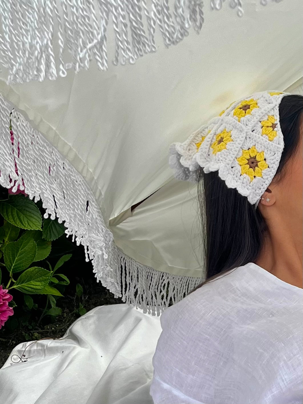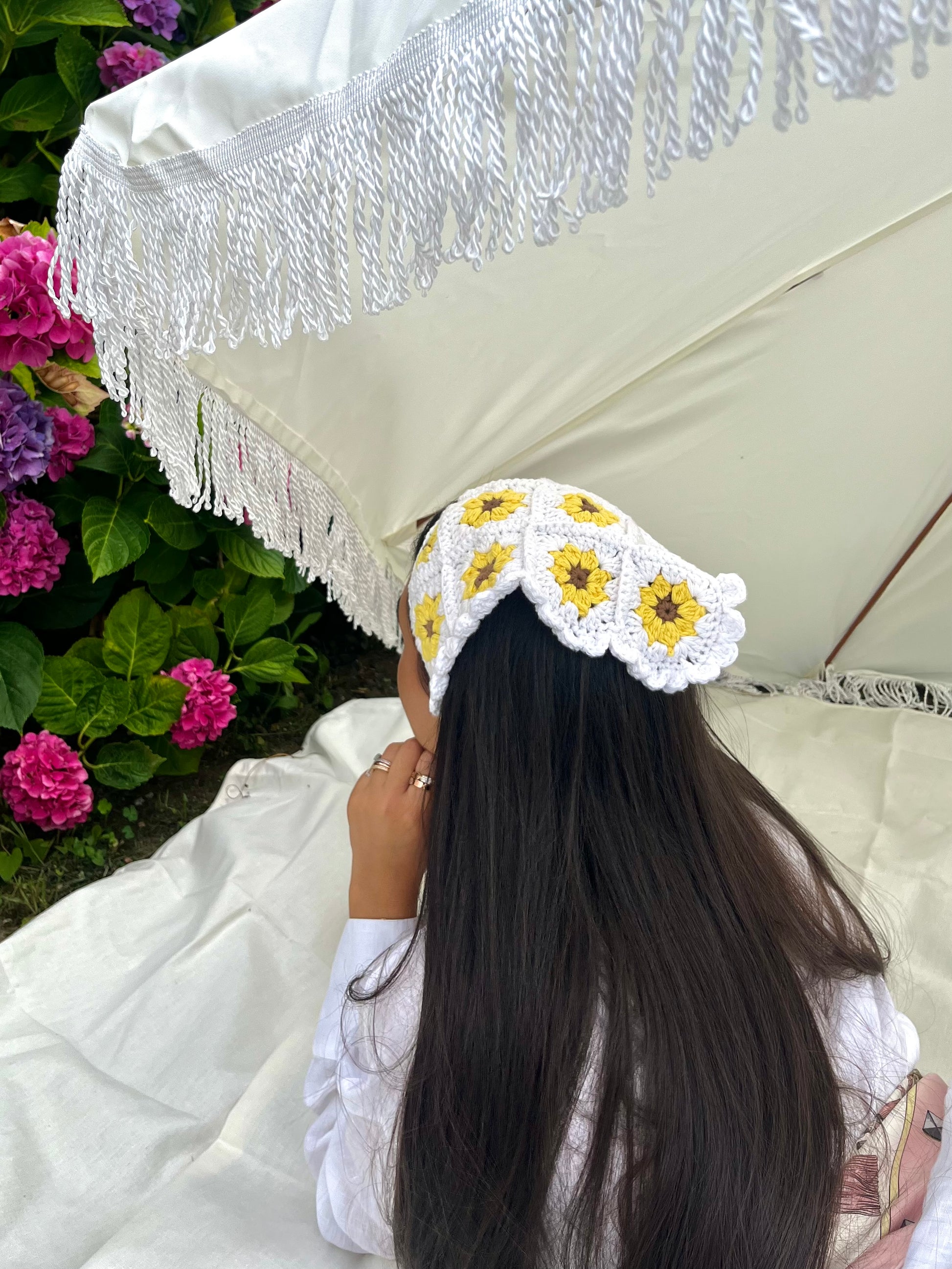 Inspiré des tournesols qui suivent la lumière, ce bandana jaune en forme de fleur habille tes coiffures avec tendresse.
